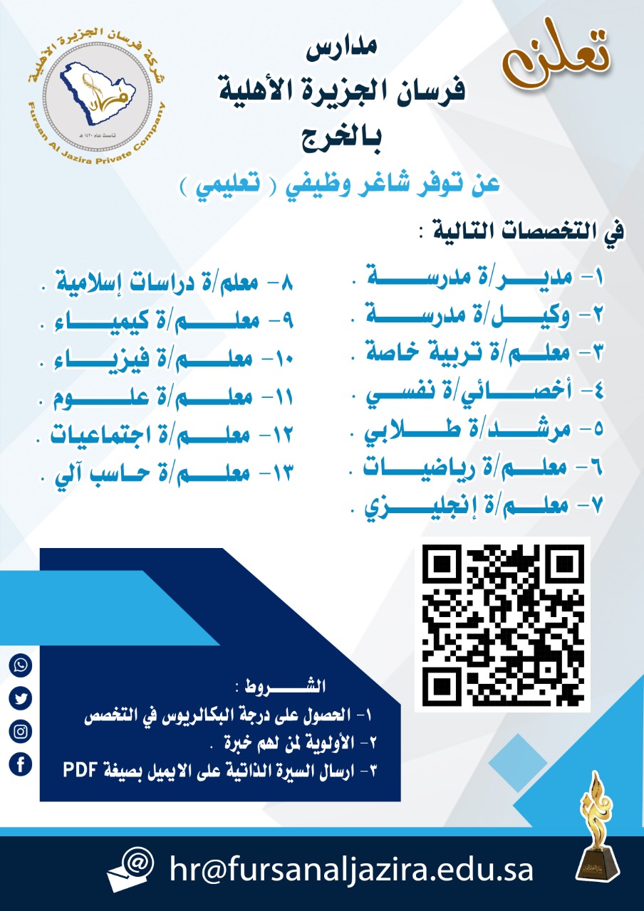 تعلن مدارس فرسان الجزيرة الأهلية عبر حسابها الرسمي (تويتر) عن فتح باب التوظيف (للجنسين ) شواغر التعليمية والإدارية (لمختلف التخصصات) في (الخرج)، وذلك على النحو الموضح ادناه :