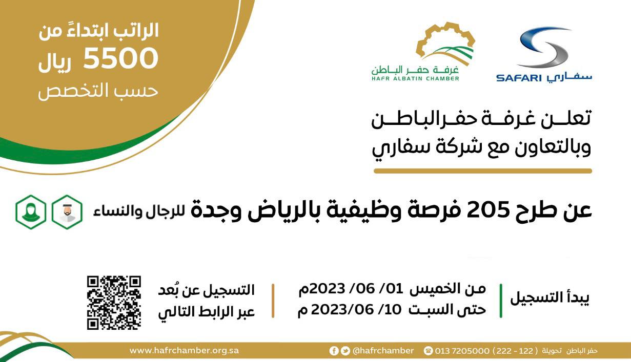 تعلن غرفة حفر الباطن عن توفر 205 وظيفة في (الرياض) و (جدة) لدى شركة سفاري برواتب تبدأ (5500 ريال)، واشترطت الغرفة أن يكون المتقدم أو المتقدمة سعودي الجنسية، وذلك على النحو الموضح ادناه